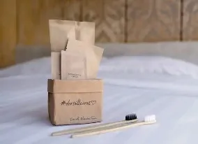 我們送給客人的小禮物多以環保材質製成。全棉質鞋袋、以防水耐用的水洗牛皮紙袋包裝的綠色植物等,皆可反覆重用,並成為客人可持續生活的一部分。